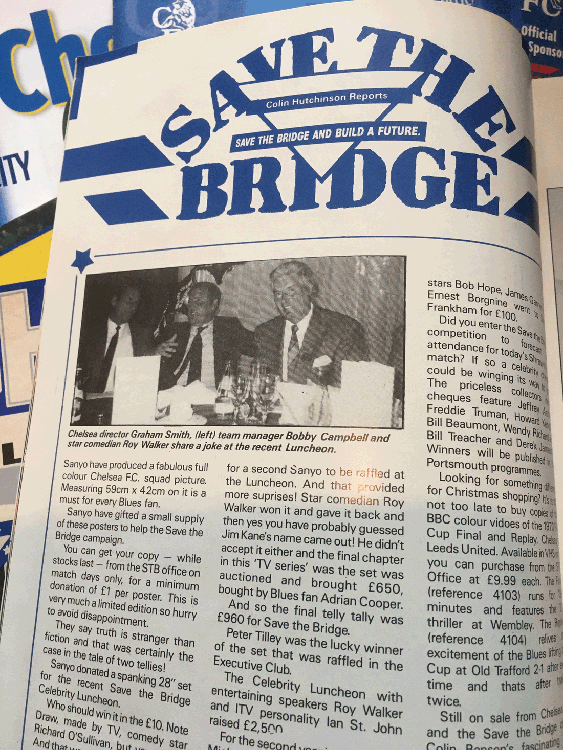 It was ironic that the club celebrated its 3,000 League game at a time when the future of Stamford Bridge was in doubt due to a long-running dispute with property developers who owned the freehold of the site. The programme featured a page on the fund-raising efforts to ‘Save The Bridge and Build A Future’ including a celebrity luncheon with comedian Roy Walker and ITV personality Ian St John which raised £2500 and a £10 note signed by Hollywood stars James Garner, Ernest Borgnine and Bob Hope which fetched £100!