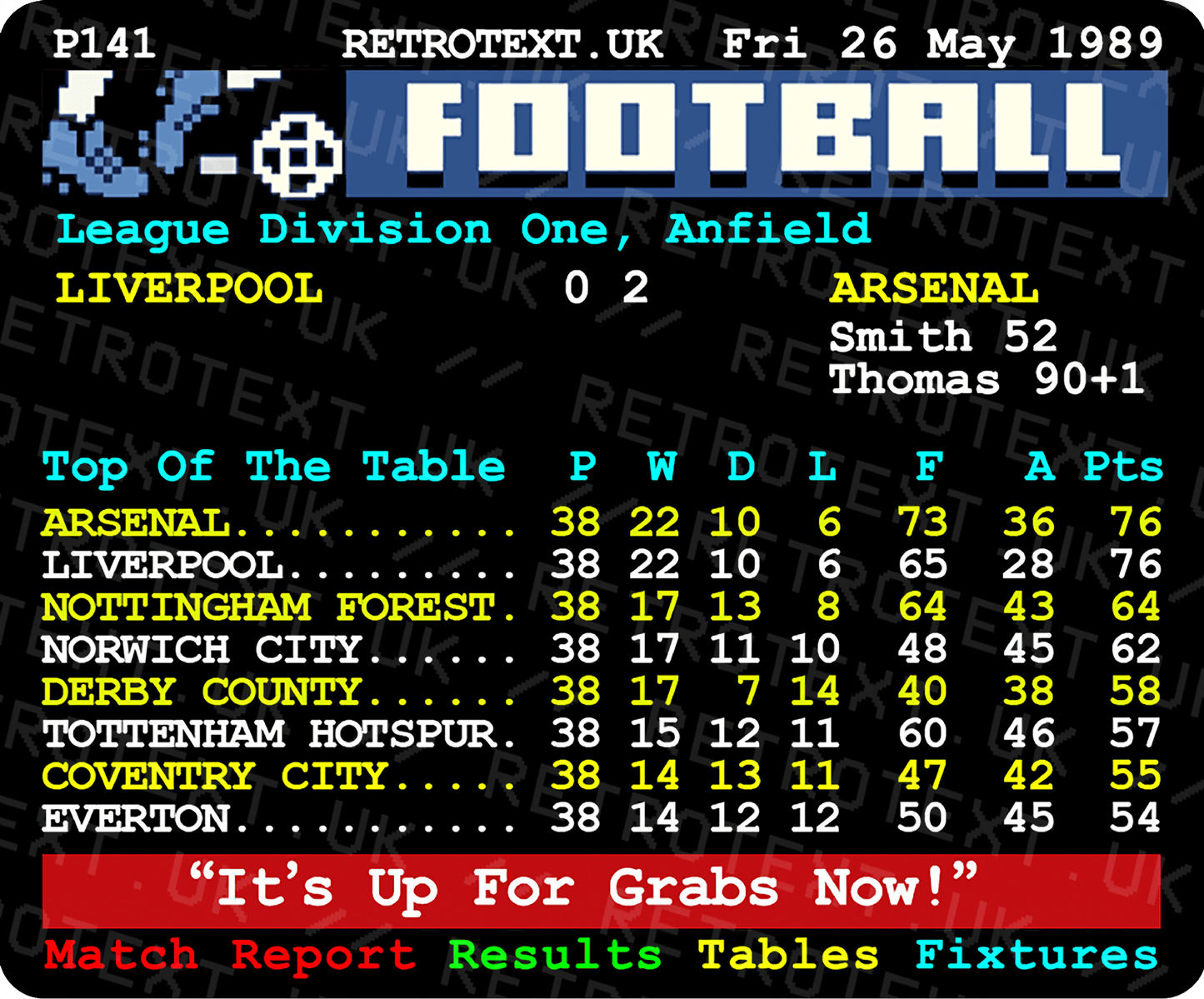 Having just beaten Everton in the FA Cup Final, Liverpool could secure another Double with a positive result against Arsenal in the last League match of the season. Arsenal had to win at Anfield by two clear goals to secure the title themselves and, unbelievably, Michael Thomas scored in injury time to do just that!