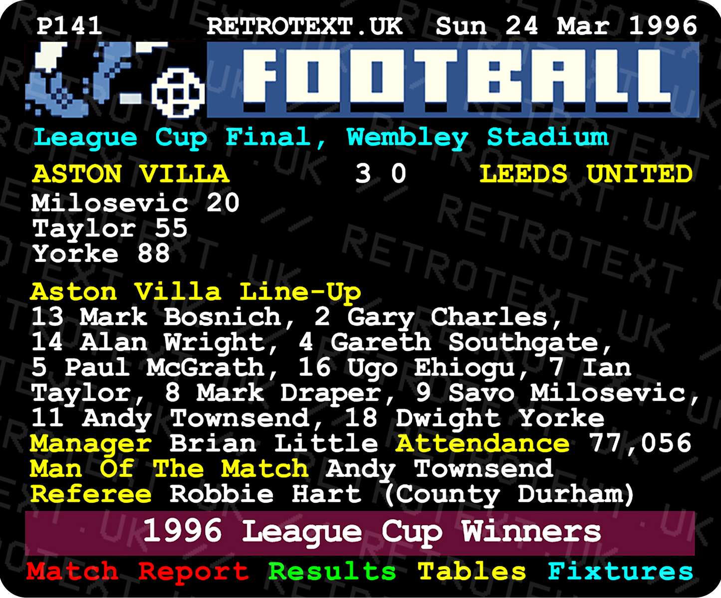 Former Manchester United boss Ron Atkinson led underdogs Aston Villa to League Cup glory in 1994 at the expense of his old club. Two years later, new manager Brian Little led Villa to their fifth League Cup success with an emphatic win over Leeds United.