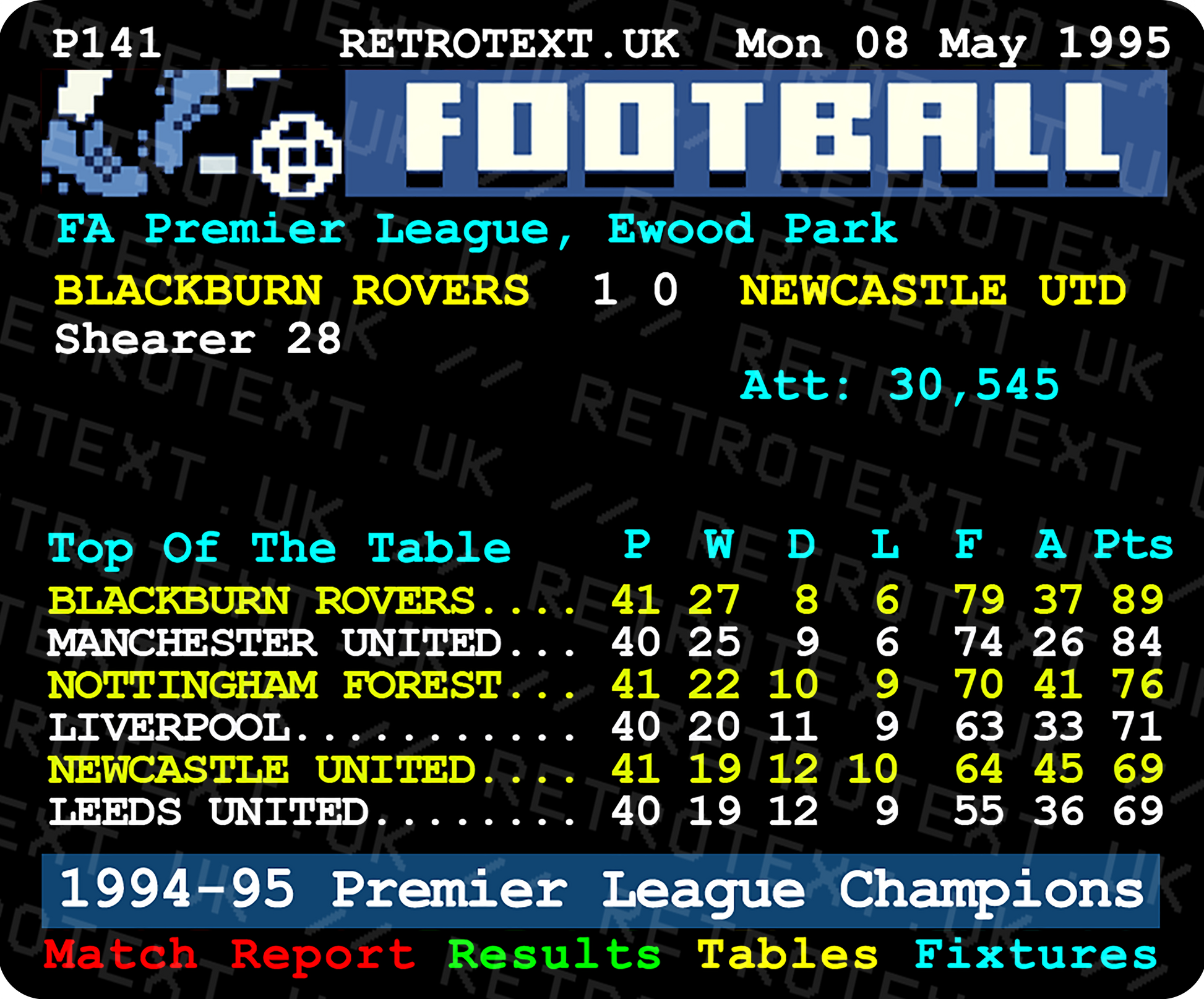 Blackburn started well at Anfield taking the lead through Alan Shearer while United went 1-0 down at West Ham. But John Barnes equalised for Liverpool and Brian McClair levelled the game at Upton Park, leaving United just one goal away from retaining the title. Despite Blackburn conceding a second goal at the death, the Red Devils could not find a winner and Rovers claimed the crown for the first time since 1914, while Kenny Dalglish became only the third manager to win the title with two different clubs.