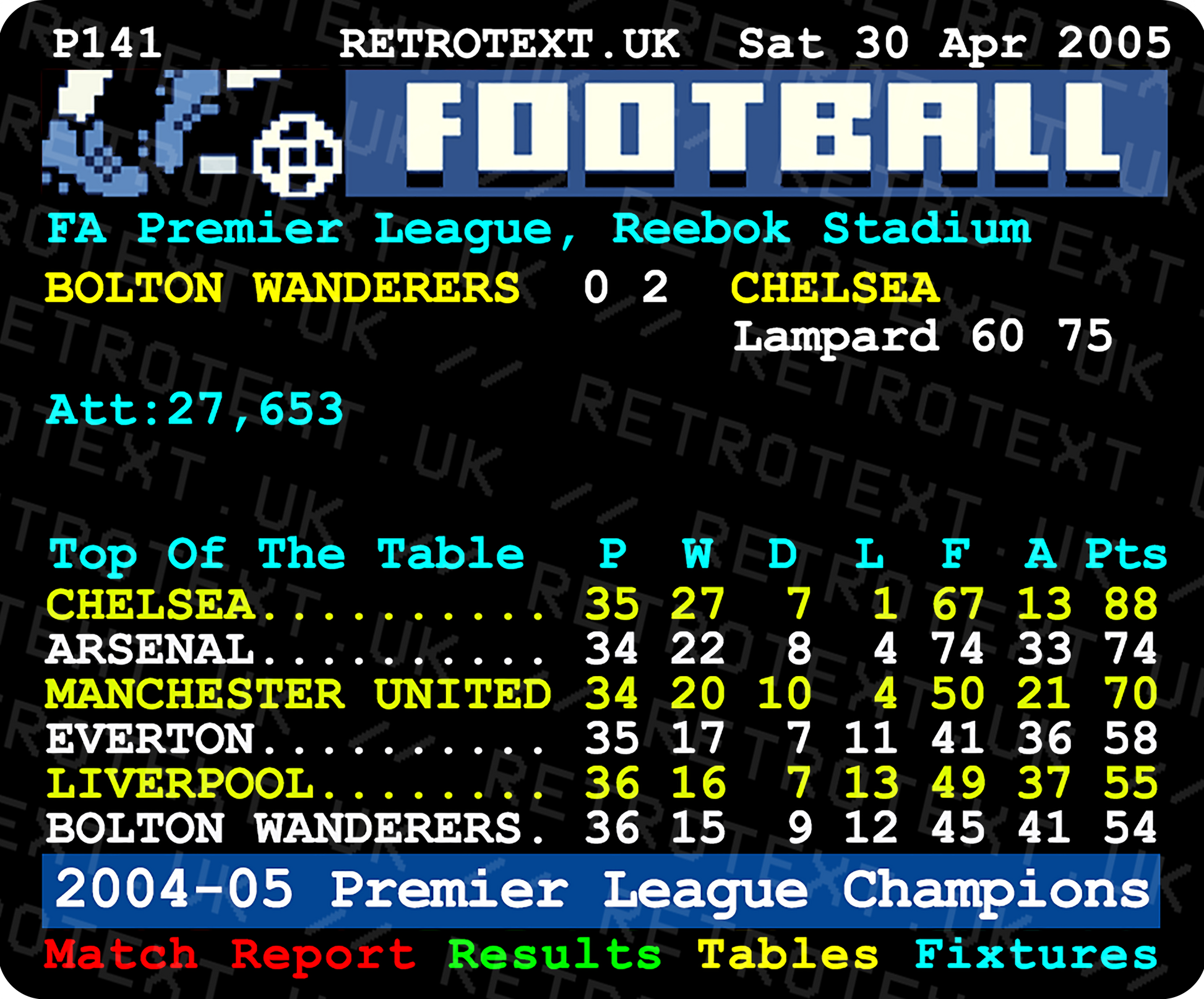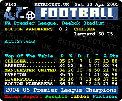 In Jose Mourinho's first season in charge, Chelsea clinched their first Premier League title as two goals by Frank Lampard earned this 2-0 win at Bolton Wanderers, taking the Stamford Bridge outfit beyond the reach of the chasing pack.