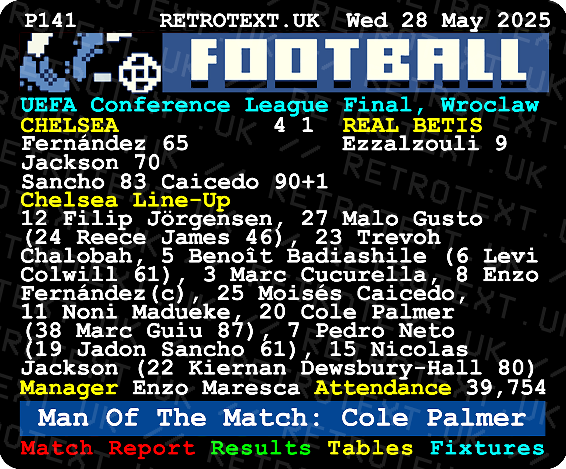 Trailing to Real Betis until midway through the second half, Man of the Match Cole Palmer turned the match on its head, providing assists for Enzo Fernandez and Nicolas Jackson before Jadon Sancho and Moises Caicedo made the game safe.