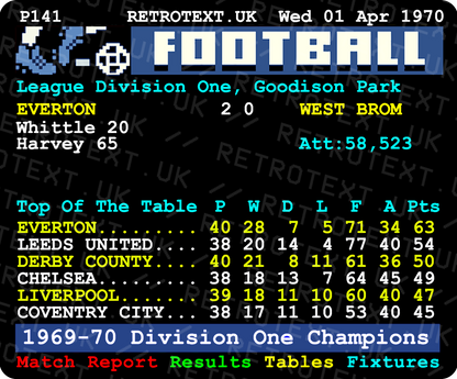 With the 'Holy Trinity' of Alan Ball, Howard Kendall and Colin Harvey at its heart, Everton won their seventh League title, and second under manager Harry Catterick, by nine points from Don Revie's Leeds United.