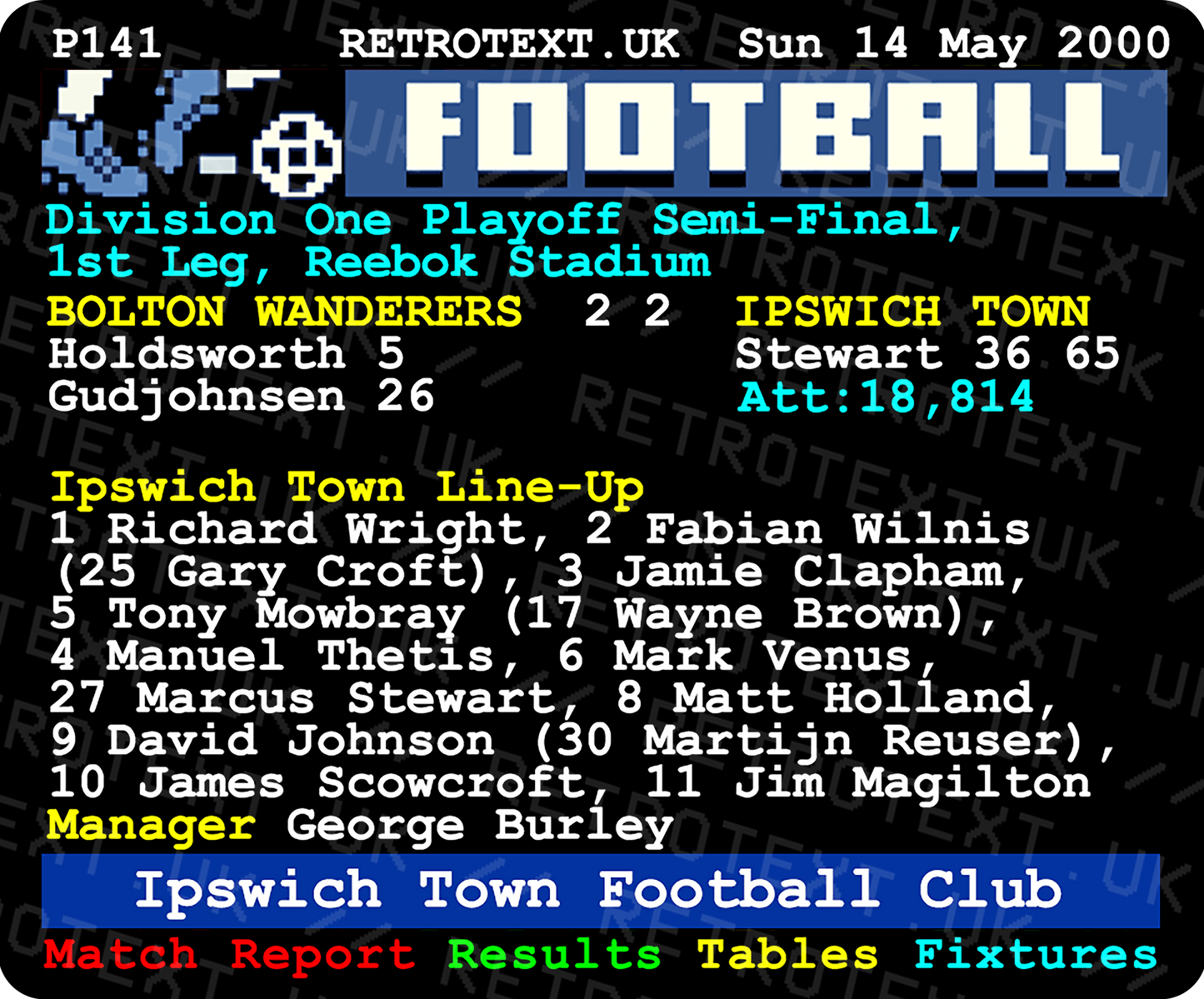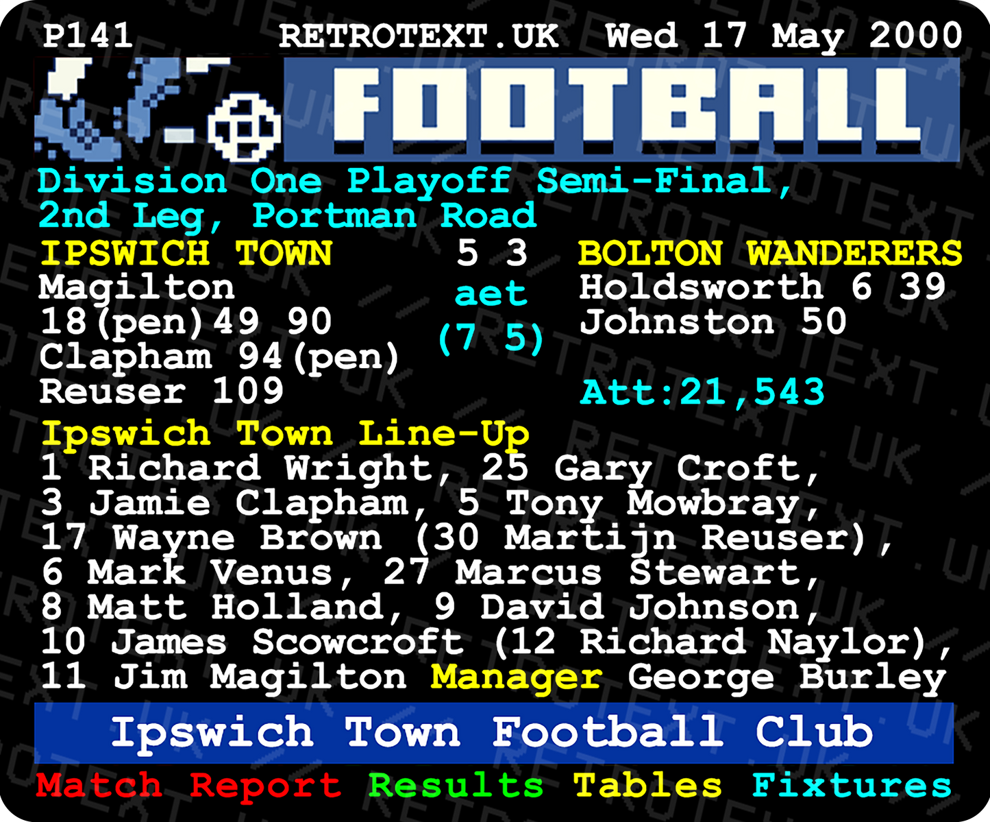 This was Ipswich Town's fourth consecutive appearance in the Division One playoffs and trailing on aggregate with a minute of normal time remaining it looked like heartache again for the Tractor Boys. But Jim Magilton popped up to level the scores with his third goal of the game and George Burley's side seized the initiative in the extra-period to book a place in the Final.