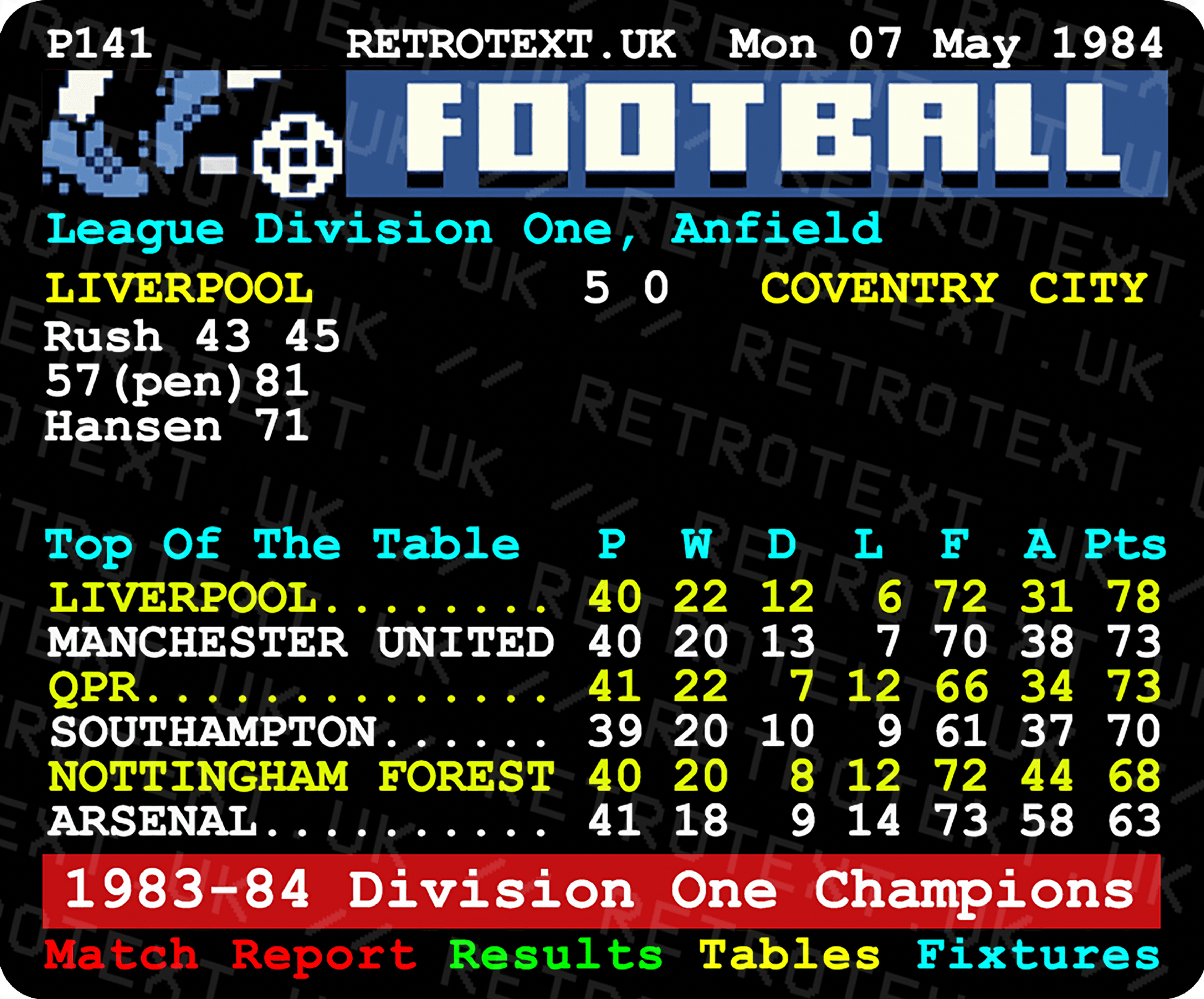 This hammering of relegation-threatened Coventry City effectively sealed a third successive League title for Liverpool, the first under new boss Joe Fagan. Goal machine Ian Rush finished the season with a total of 32 goals in the League and 47 in all competitions.