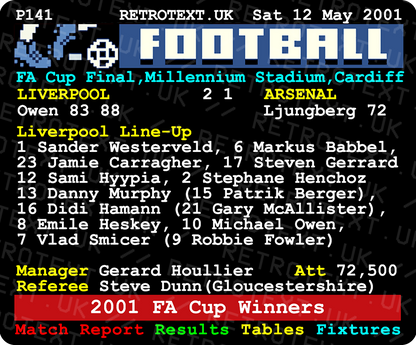 Two strikes in the last ten minutes from Michael Owen turned the match on its head as Liverpool came out on top in the first FA Cup Final played at the Millennium Stadium in Cardiff whilst Wembley was being rebuilt.