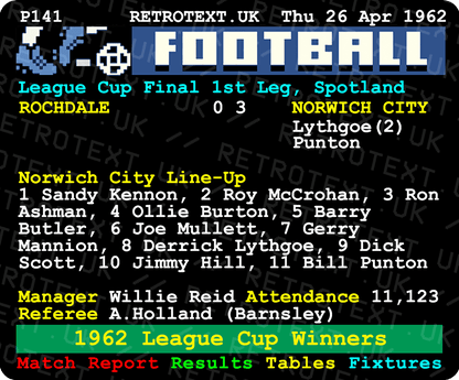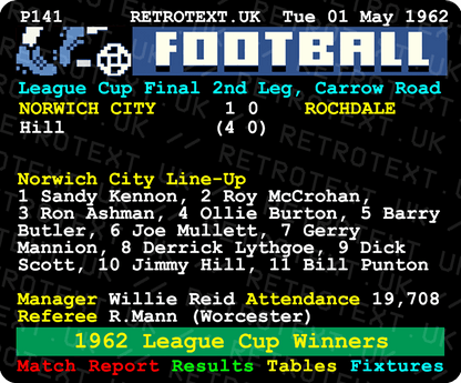 This was the second season of the League Cup and not all teams entered the competition. Norwich City of Division Two (now the Championship) came out on top against Division Four (now League Two) Rochdale to claim the club's first major honour.