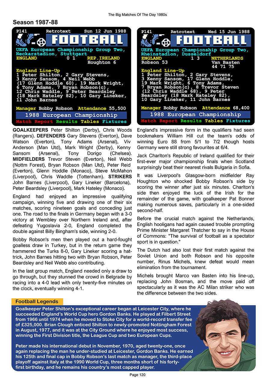 This A4 size, 152-page paperback book features all the domestic successes for English clubs in the 1980s, plus the ones in Europe in the first half of the decade, as well as the Home International Championships, two World Cups and the Euros of 1980, 1984 and 1988.
