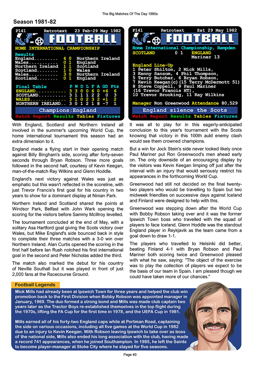 This A4 size, 152-page paperback book features all the domestic successes for English clubs in the 1980s, plus the ones in Europe in the first half of the decade, as well as the Home International Championships, two World Cups and the Euros of 1980, 1984 and 1988.