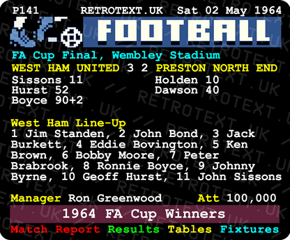West Ham won the 1964 FA Cup in dramatic fashion, courtesy of an injury time goal from Ronnie Boyce, against a Preston team in which future Everton legend Howard Kendall became then the youngest player to appear in a Final, aged 17 years 345 days. A year later, the Hammers were back at Wembley for the European Cup-Winners' Cup Final which they lifted thanks to a brace from Alan Sealey.